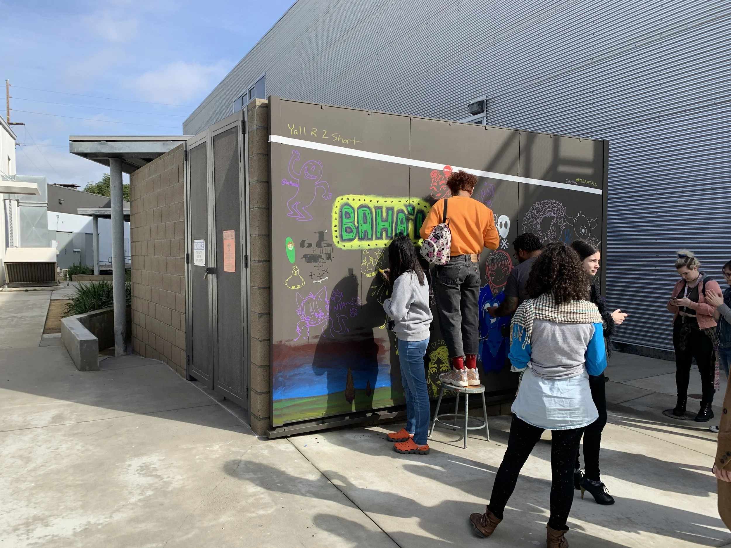 “The Freedom Wall” at Otis College of Art and Design is a “continuous” outdoor creative space where students can express themselves and/or visually share ideas, text, and images. The Freedom wall is overseen by the Student Voice Association(SVA), which seeks to provide a safe place for student expression while maintaining a respectful and inclusive environment for the College community. This was a collaborative project executed by the Wood and Metal Shop which includes three wood panels, steel framework, mounting, and a paint trough at the base.