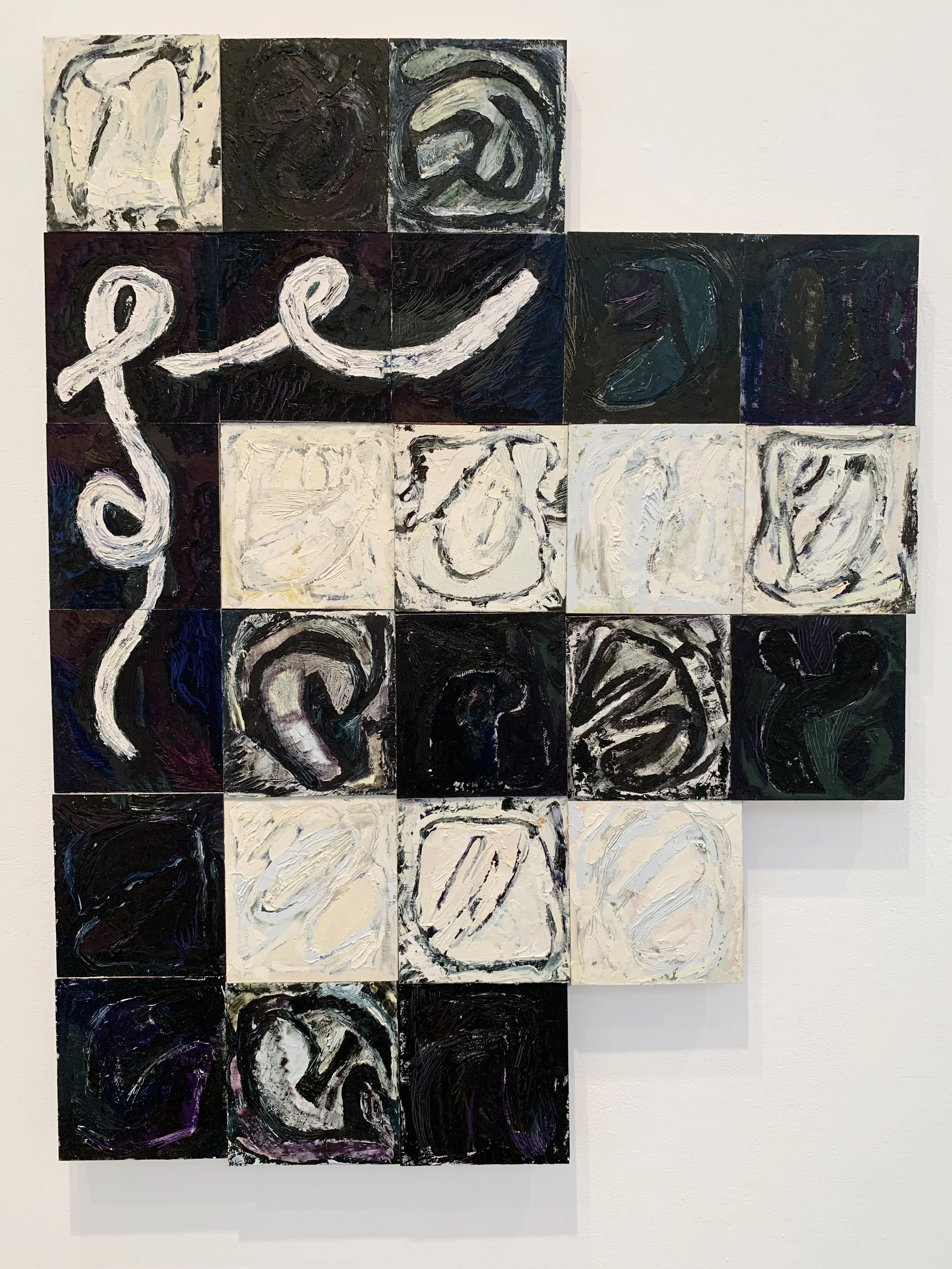 Biomorph No. 1, 2019. Oil on wood panel (x25) composed with bolts and wing nuts; This work is modular.